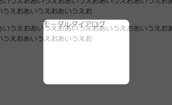 <html> <head> <style> body { position: relative; } .main { position: relative; } .modal_overlay { position: absolute; top: 0; left: 0; right: 0; bottom: 0; background-color: #000; opacity: 0.6; } .modal_window { position: absolute; top: 50%; left: 50%; transform: translate(-50%, -50%); width: 200px; height: 150px; background: #fff; border-radius: 10px; </style> </head> <body> <div class="main"> <p>あいうえおあいうえおあいうえおあいうえおあいうえおあいうえおあいうえおあいうえお</p> <p>あいうえおあいうえおあいうえおあいうえおあいうえおあいうえおあいうえおあいうえお</p> </div> <div class="modal_overlay"> <div class="modal_window"> <div class="content"> モーダルダイアログ </div> </div> </div> </body> <html>